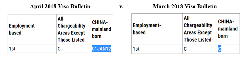 Fortunately, the visa bulletin is subject to change. Last month in March, EB-1 beneficiaries may file the green menu application meantime with the EB-1 petition (aka I-140 form). However, this month, the cutting-off date retrogressed to January 1, 2012 for Chinese nationals – a huge difference!